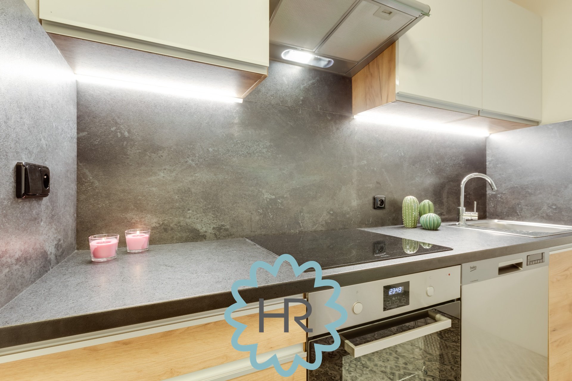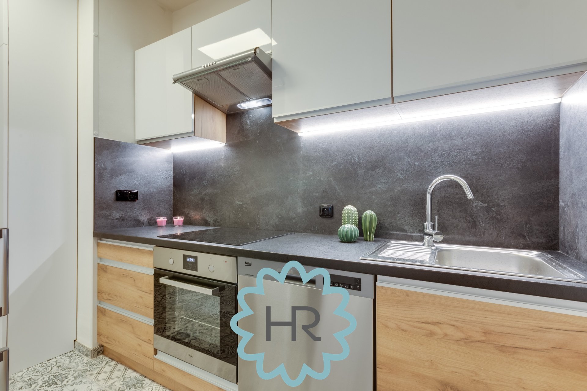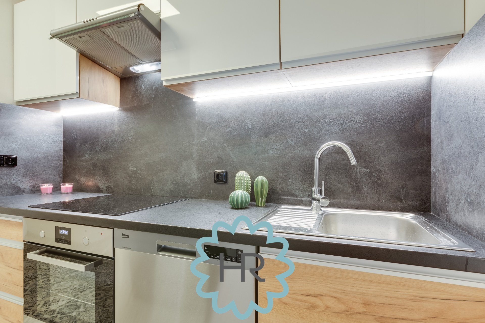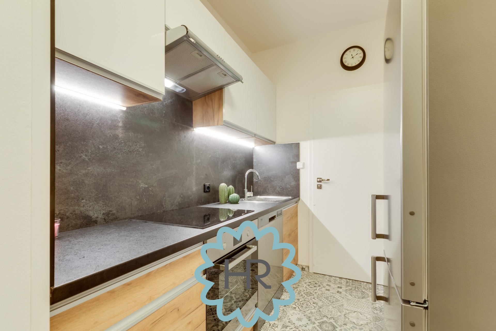V bytě je nainstalovaná úplně nová kuchyň s veškerými spotřebiči: lednice, digestoř, trouba, sporák, myčka atd.