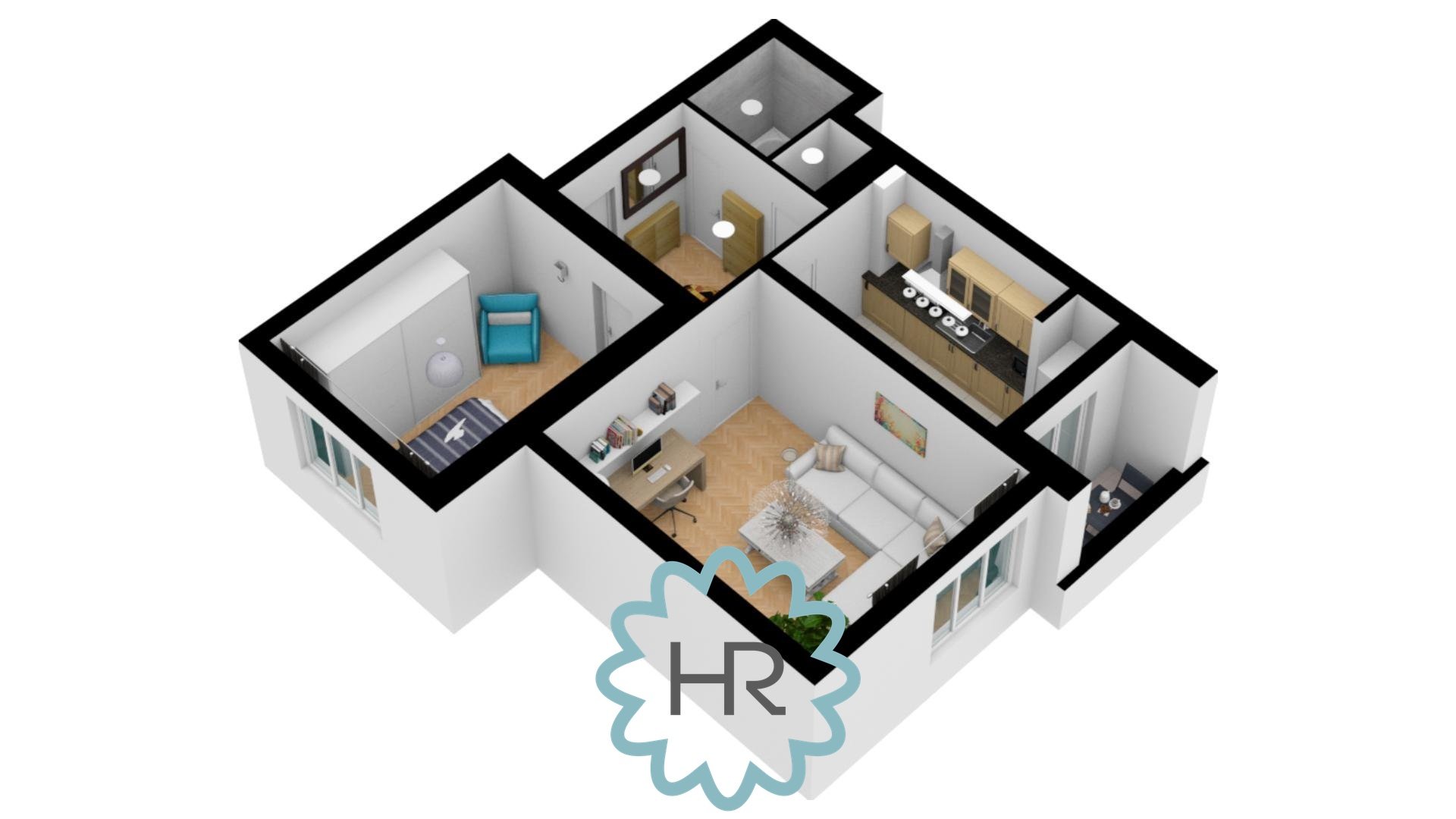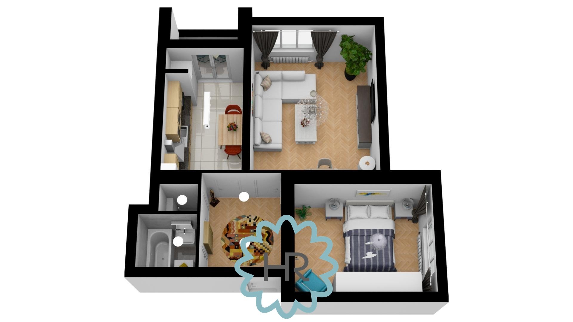 Byt je kompletně zařízený a jeho součástí je kuchyně s obývacím pokojem, samostatná ložnice, koupelna se sprchovým koutem, pračkou a oddělené WC.