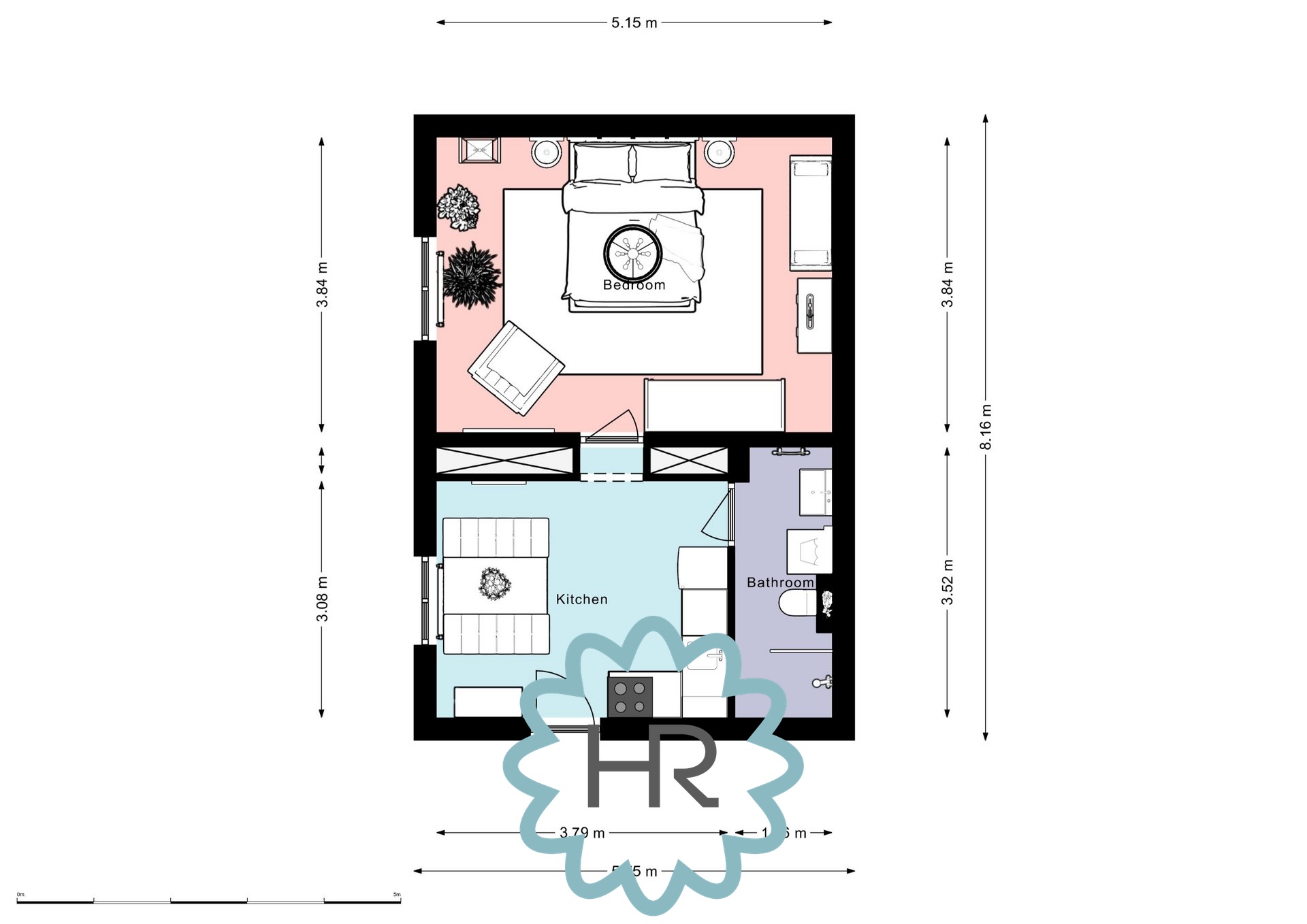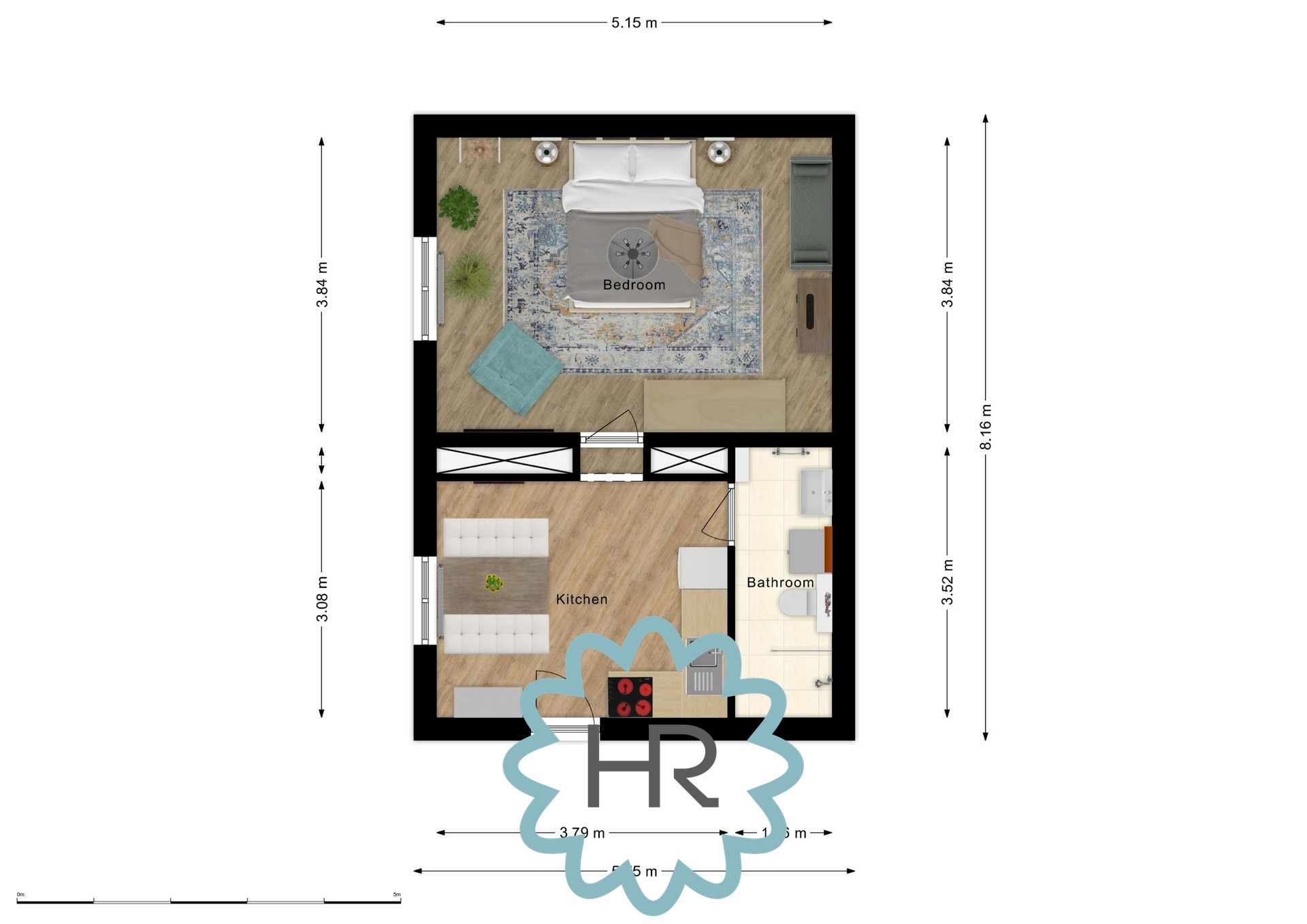 Byt se nachází v přízemí domu a jeho součástí jsou 1 samostatná ložnice, kuchyně s jídelním stolem, koupelna se sprchovým koutem, WC a pračkou.