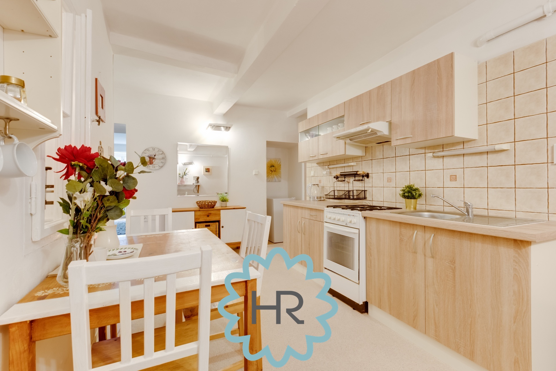 V bytě je nainstalovaná kuchyň s veškerými spotřebiči: lednice, digestoř, trouba, sporák, myčka atd.