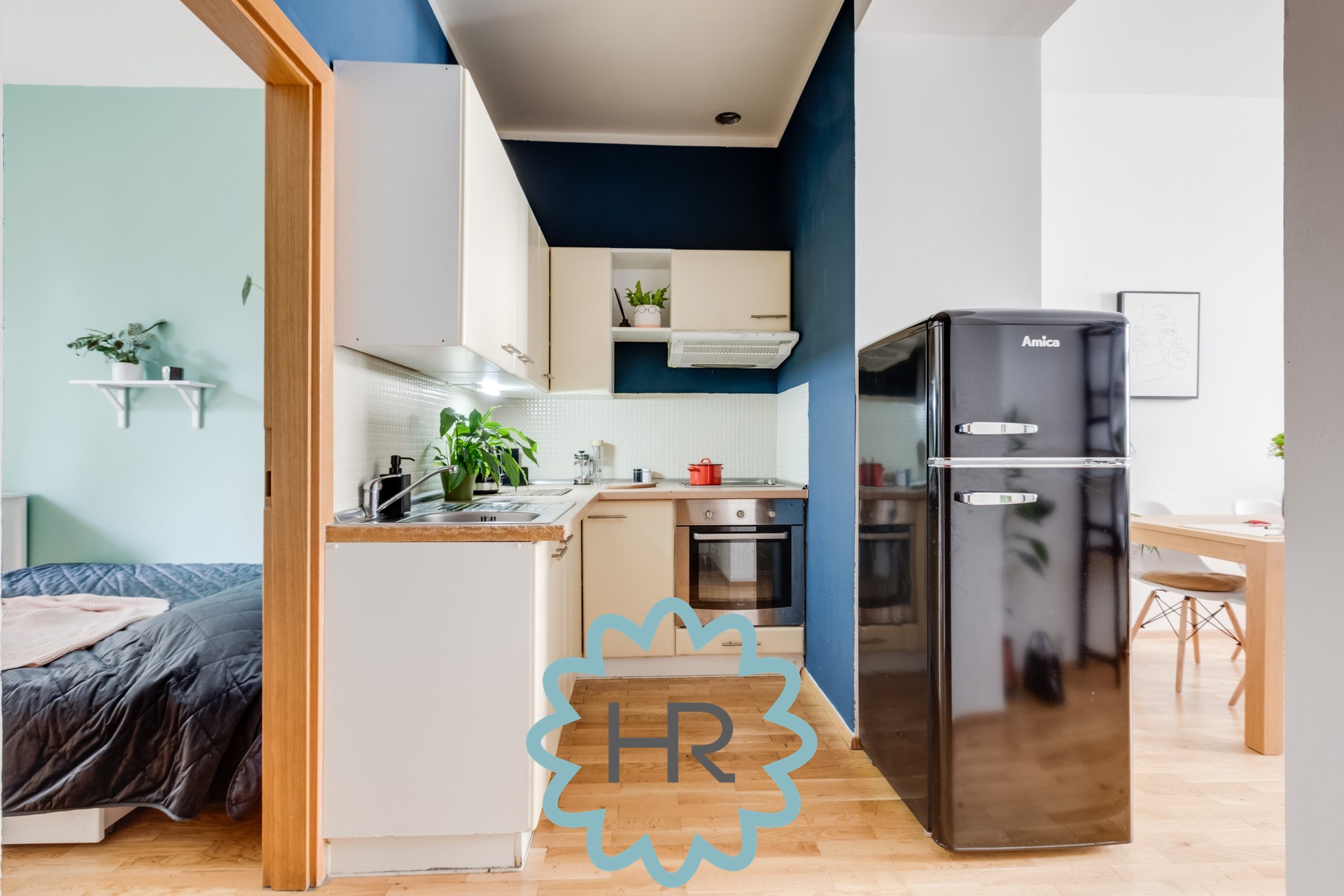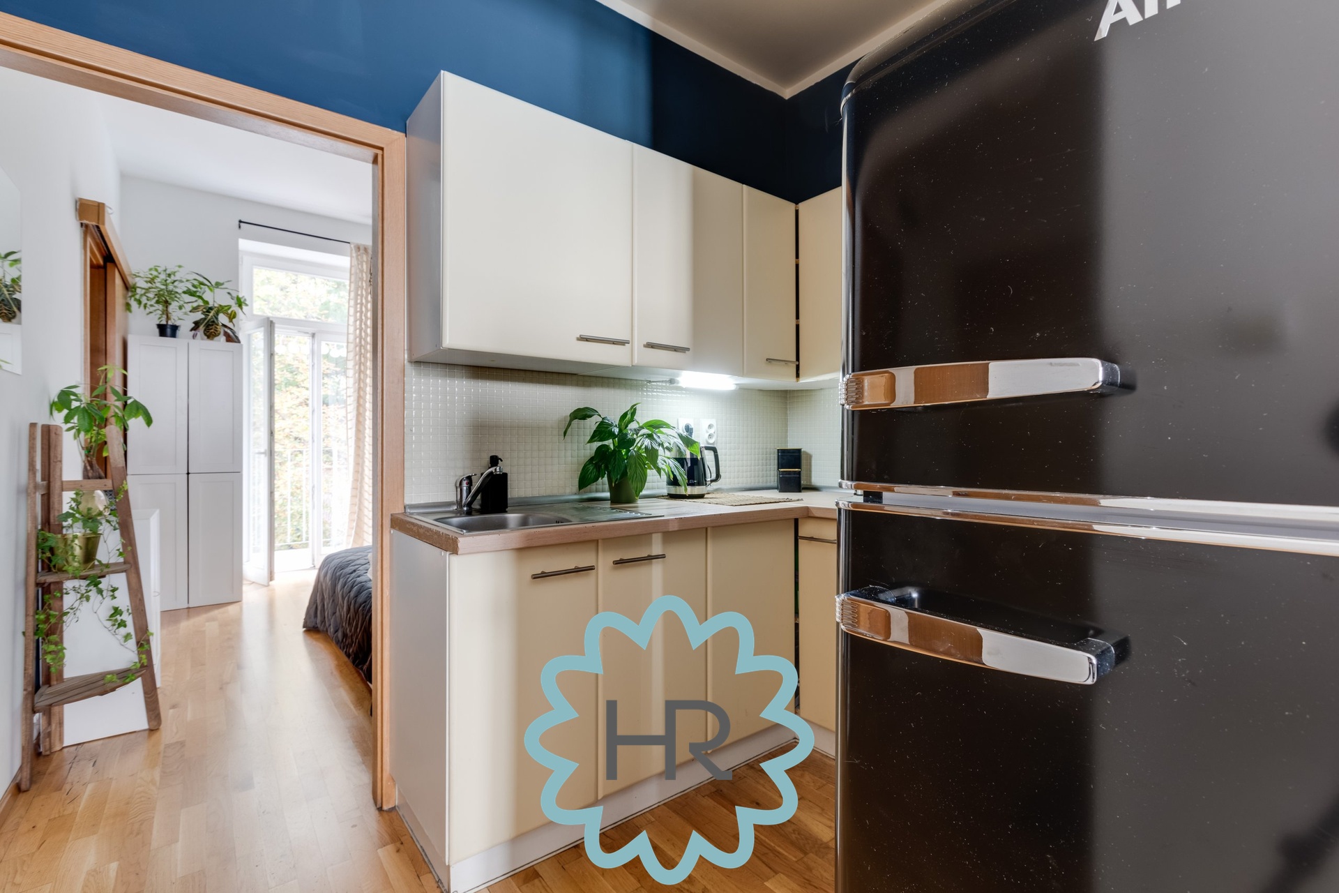 V bytě je nainstalovaná kuchyň s veškerými spotřebiči: lednice, digestoř, trouba, sporák, myčka, atd.