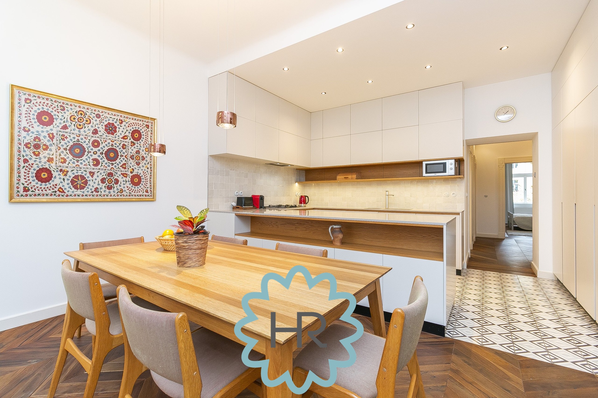 V bytě je nainstalovaná kuchyň s veškerými spotřebiči: lednice, digestoř, trouba, sporák, myčka, mikrovlnka atd.